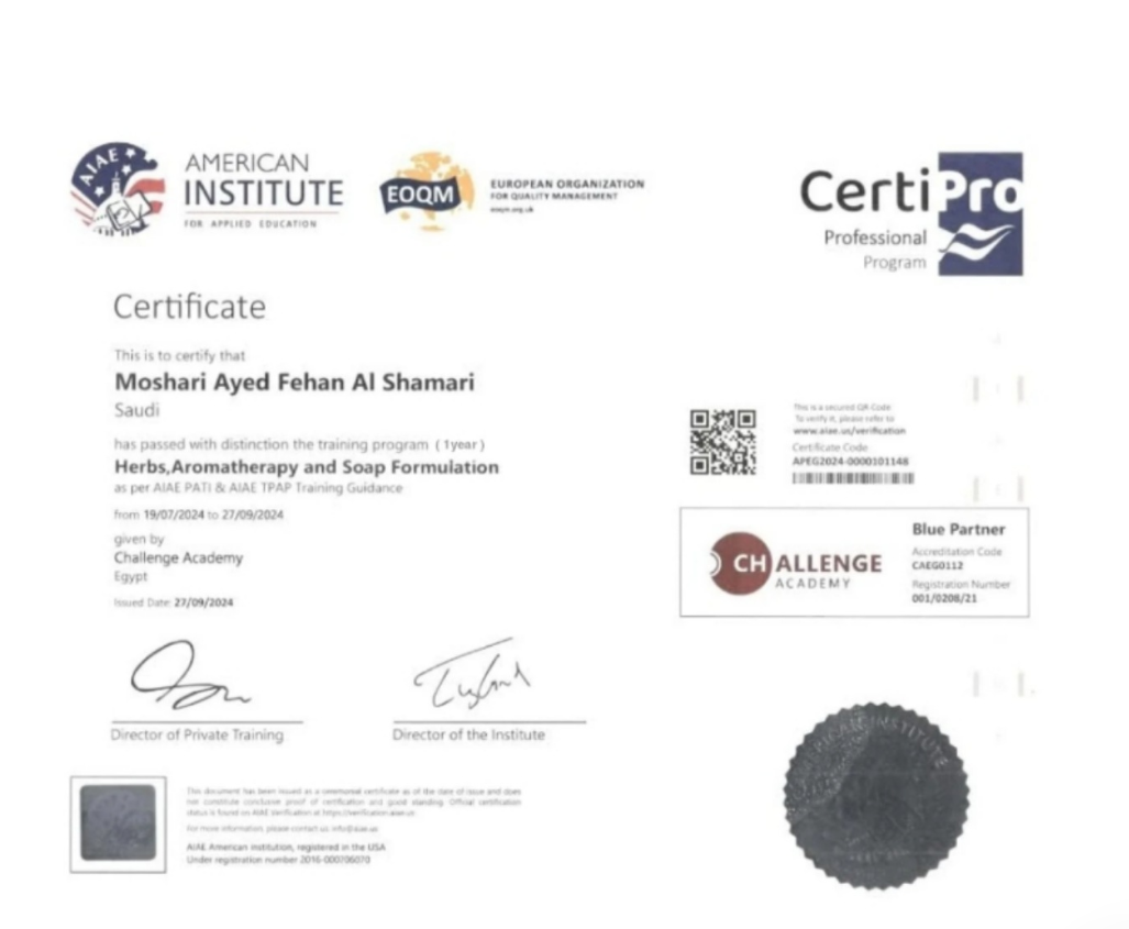حصل الدكتور مشاري العايد على شهادة الطب البديل الأعشاب والتجميل، والمعتمدة دوليًا من المعهد الأمريكي للتعليم التطبيقي ومعتمدة من eoqm المنظمة الأوروبية لإدارة الجودة ومعتمدة من CHALLENGE ACADEMY، وله مقرين في السعودية والكويت، بالإضافة إلى وجود سلسلة متاجر الشفاء في دول الخليج.